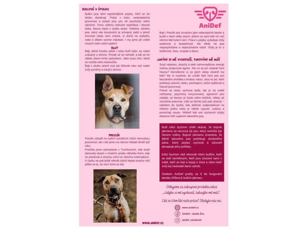 Bullíci jsou těmi nejcitlivějšími pejsky, kteří se do útulku dostávají. Pobyt v kotci, nedostatečná pozornost a pohyb jsou pro ně psychicky velmi náročné. Tomu celému bohužel nepřidává i dlouhá doba, kterou často v útulku stráví. Koupí jakéhokoliv výrobku z edice "Bull" přispějete na opuštěná a týraná zvířata v útulku AniDef.